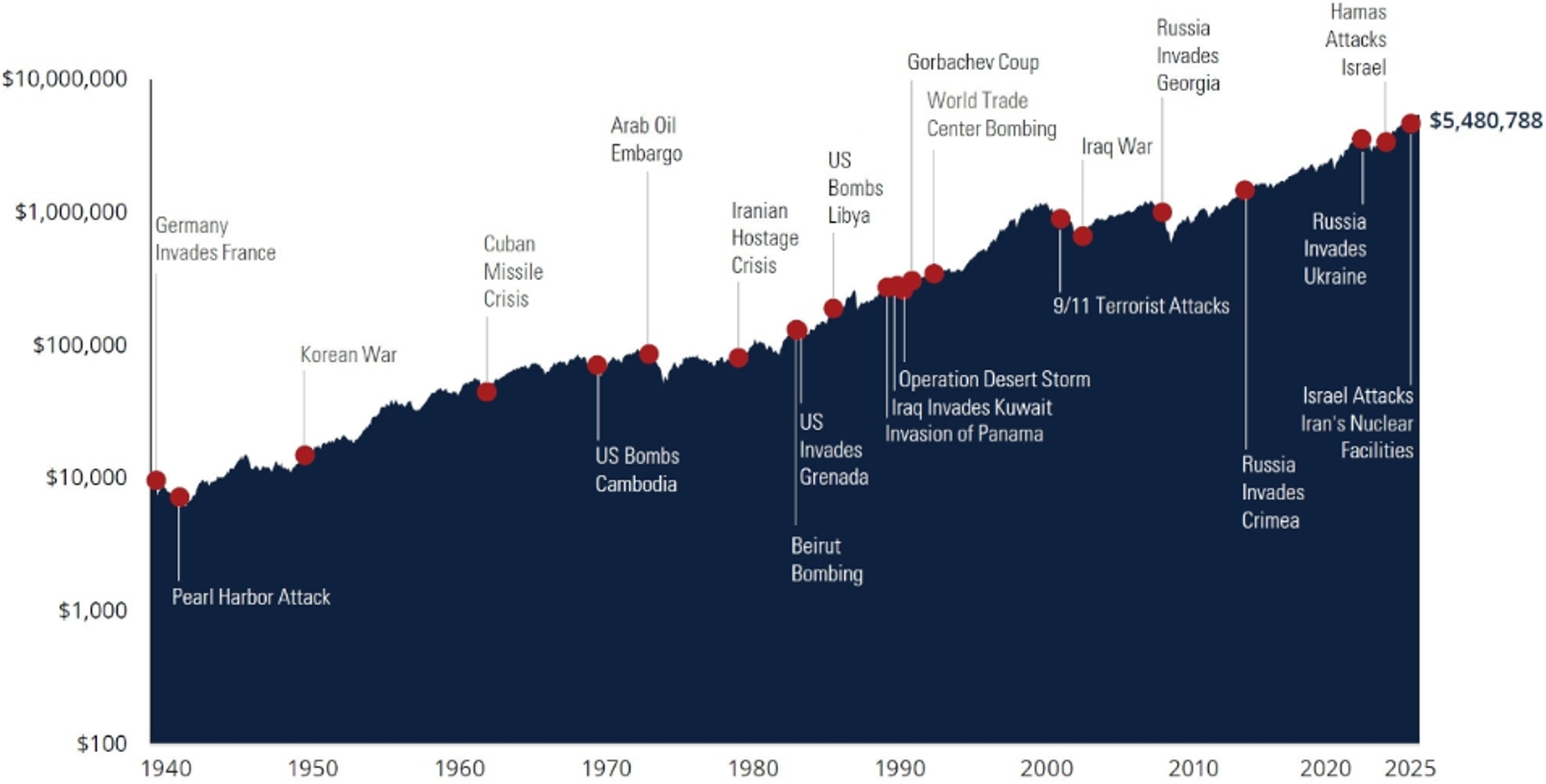 Disclosure: All indexes are unmanaged and cannot be invested in directly. Past performance is no guarantee of future results. Events not labeled include Hungarian uprising ('56), Suez crisis ('56), Gulf of Tonkin Incident ('64), Six-Day War ('67), Yom Kippur War ('73), Israel-Hamas War ('23), U.S.-Israeli Airstrikes of Iran Nuclear Sites ('25). The modern design of the S&P 500 stock index was first launched in 1957. Performance back to 1950 incorporates the performance of the predecessor index, the S&P 90.